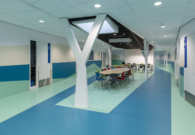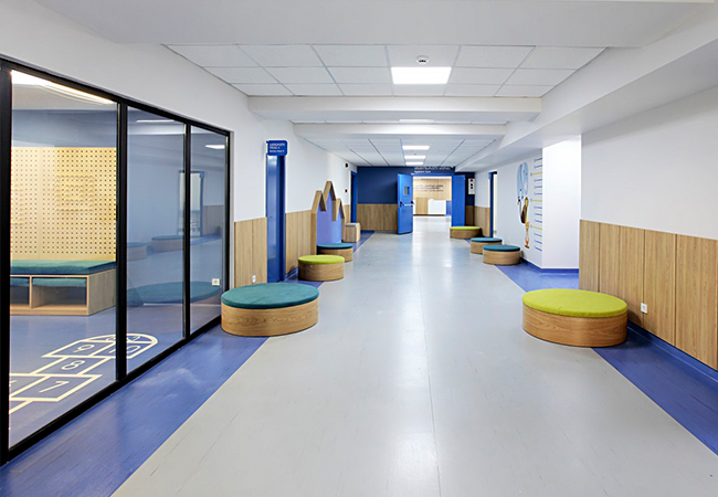 სხვადასხვა ტიპის ჰომოგენური ვინილის საფარით მოვაწყვეთ ბავშვთა საავადმყოფოს მისაღები, კორიდორები და პალატები